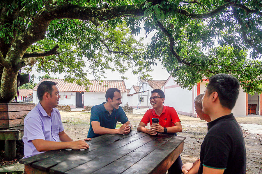 Huang Haijun (3rd L), the Party Secretary of Lingmen Village, Wanling Town, Qiongzhong County, central Hainan Province, chats with farmers and the reporter from People's Daily Online (2nd L). (People's Daily Online/Ji Zihui)