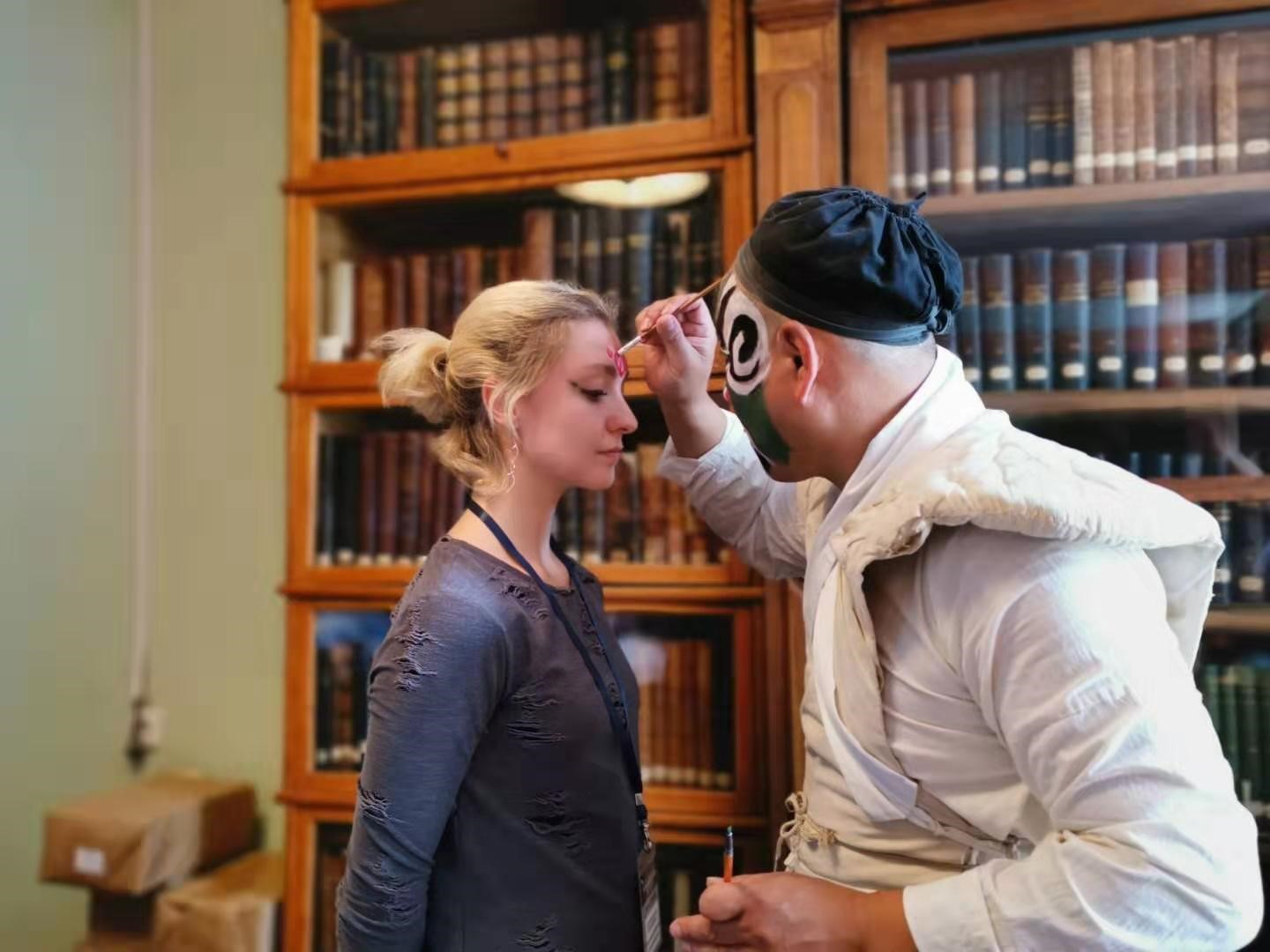 Performers are doing makeup before performing Kunqu opera “The Peony Pavilion” at the Chekhov International Theatre Festival 2019. (Wu Yan / People's Daily)