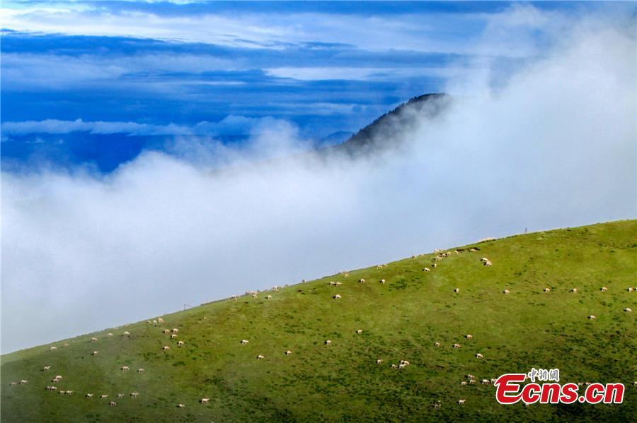 Grassland at the foot of the Qilian mountains lay shrouded in mist in Sunan Yugur Autonomous County, Northwest China’s Gansu Province. (Photo: China News Service/Yang Shijun)