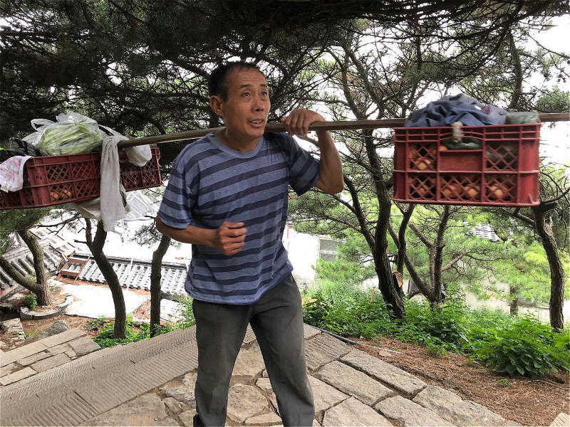 53-year-old Geng Yukui is one of the remaining strongmen, carrying around 50kg on a pole, which he sits on either shoulder. He makes the long journey up the mountain 2-3 times a day, depending on demand.