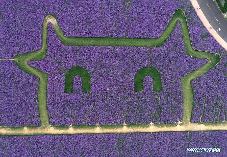 Aerial photo taken on July 17, 2019 shows a verbena field in Binhai New Area of north China's Tianjin. (Xinhua/Yue Yuewei)