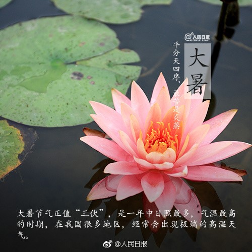 According to the traditional Chinese lunar calendar, a year consists of 24 solar terms. Major Heat or Dashu in Chinese, is the 12th solar term, whose arrival symbolizes that most parts of China have entered the hottest season of the year. In classical Chinese, the character “Shu” was compared to “boiling,” delivering an image that the earth is like a pot of boiling water during this time period.