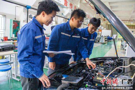 Students in a vocational school in Guangxi check a car. (Photo/Chinanews.com)