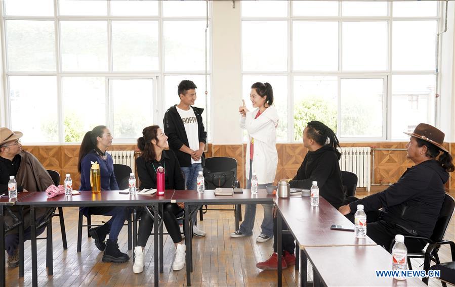 Sun Xueman (3rd R), a mezzo-soprano from China National Opera House, talks with members of an art troupe from Deqen Tibetan Autonomous Prefecture, in Shangri-la City of Deqen Tibetan Autonomous Prefecture, southwest China's Yunnan Province, July 27, 2019. China National Opera House launched an event here on Saturday in which artists in different squads gave lectures, staged performances and communicated with counterparts. (Xinhua/Jin Liangkuai)