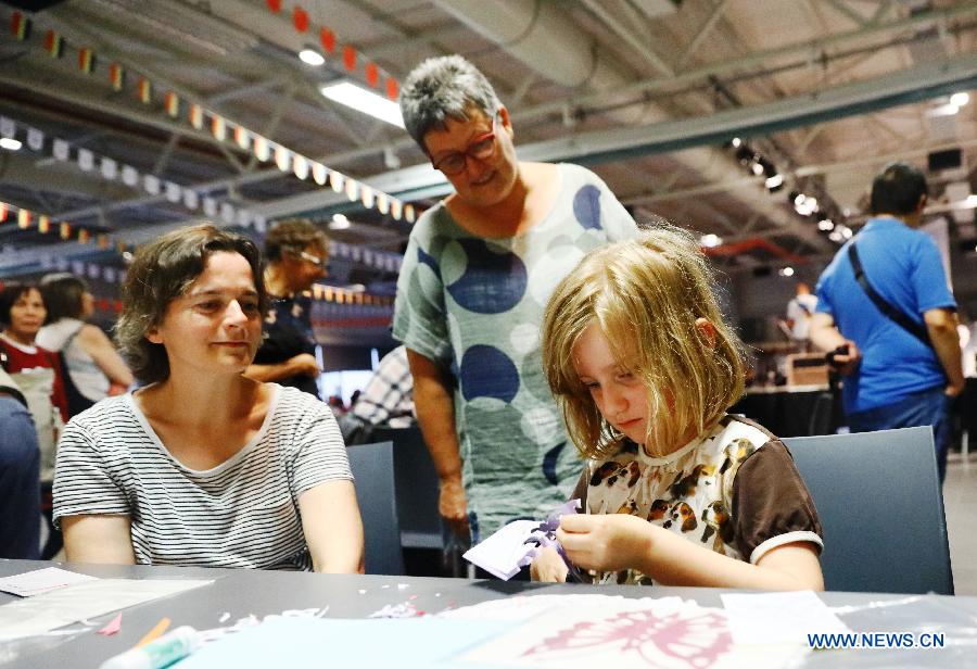 A Belgian girl tries Chinese paper-cutting during the "EU-China Youth Music & Art Festival 2019" held in Zandhoven, a small town in north Belgium, July 27, 2019. The "EU-China Youth Music & Art Festival 2019" opened on Saturday night in Zandhoven. Young people and folk artists from Belgium and China gathered for musical performances. (Xinhua/Pan Geping)
