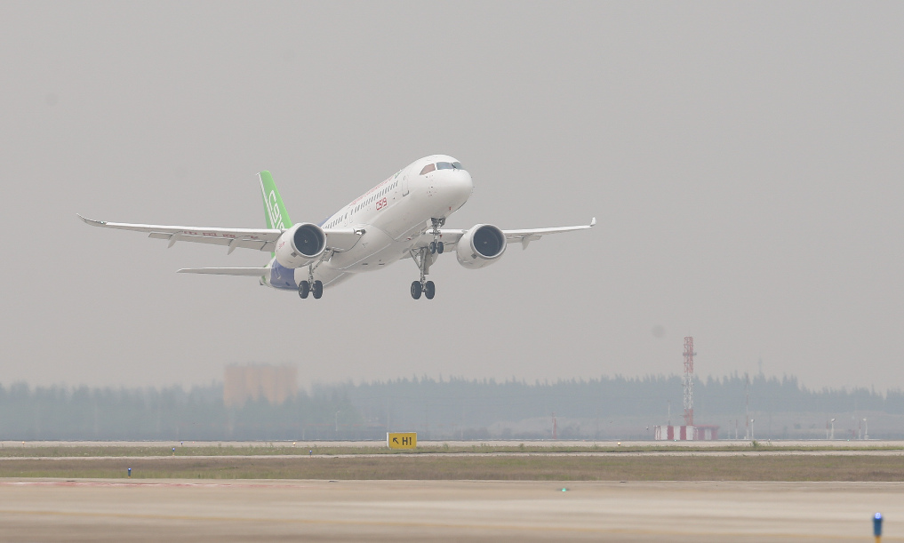 The C919, China's first homegrown trunk jetliner, conducted a successful maiden flight on May 5, 2017, at Shanghai Pudong International Airport.