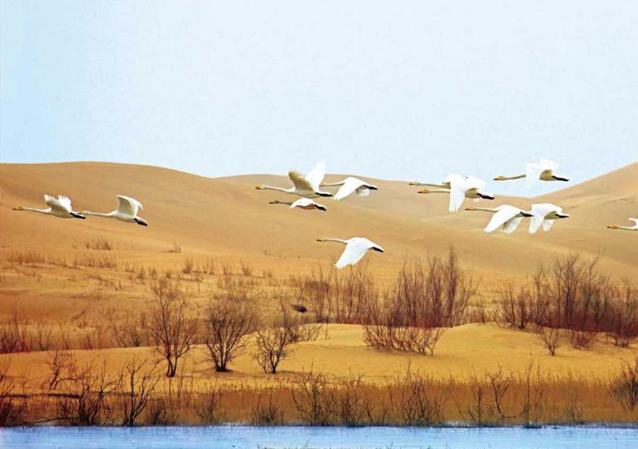 Over a thousand birds live in or around the Kubuqi Desert in North China's Inner Mongolia autonomous region. (Photo/Chinadaily.com.cn)