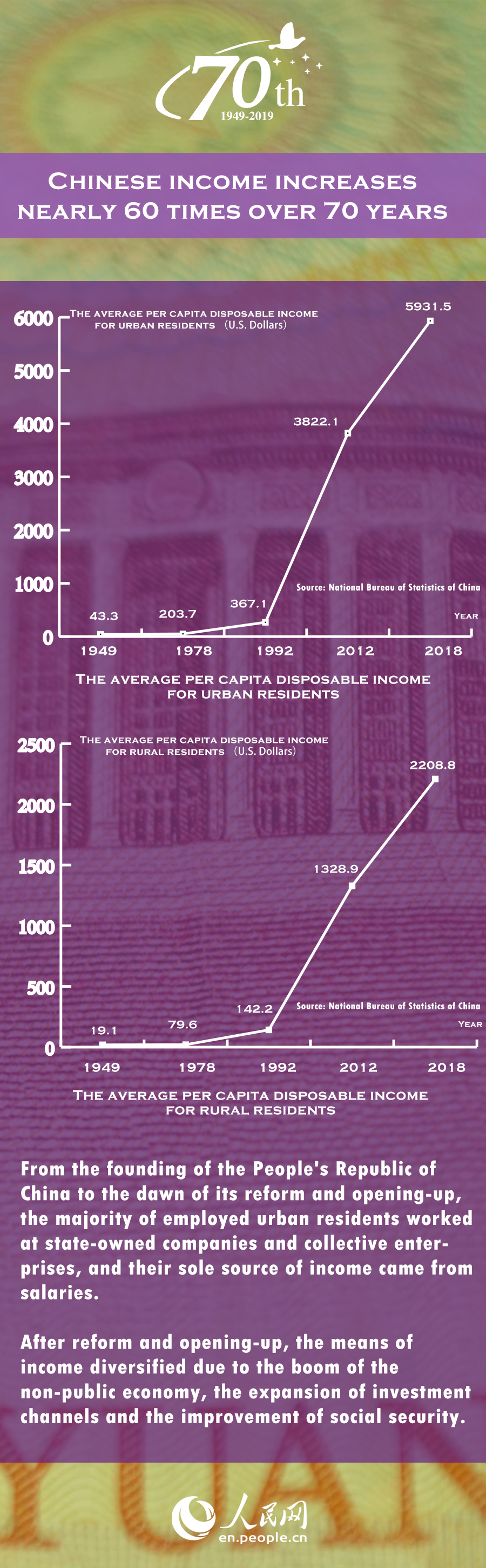 China's national per capita disposal income in 1949 was only 49.7 yuan (about $7). In 2018, that figure reached 28,228 yuan (about $3,998), increasing by 566.6 times in nominal terms, with an inflation-adjusted growth rate of 59.2 times, achieving an annual growth rate of 6.1 percent.