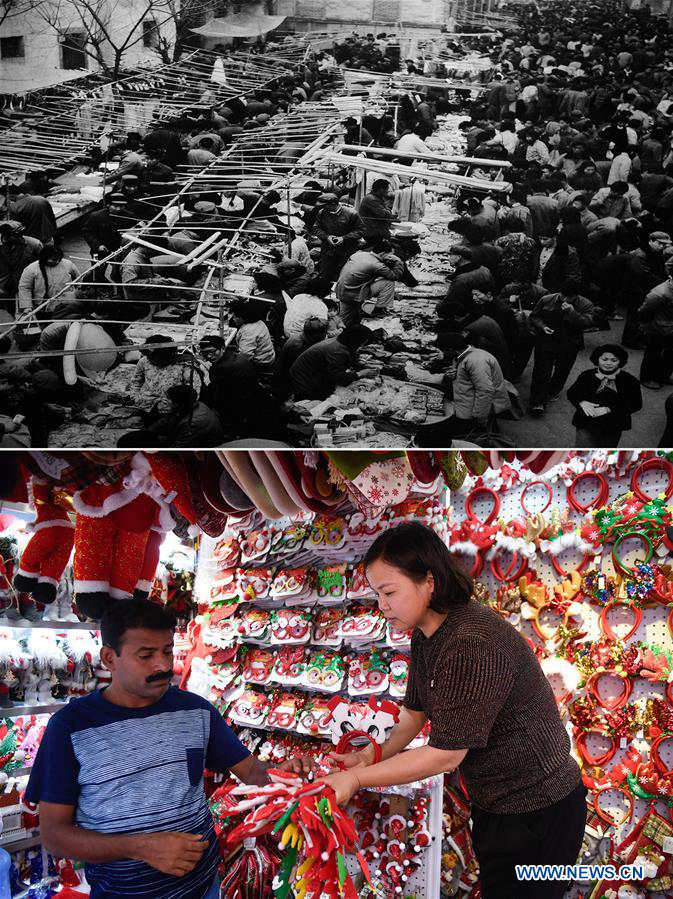 Top: File photo taken in Sept. of 1982 shows Yiwu small commodity market in Yiwu, east China's Zhejiang Province. Bottom: Photo taken on June 26, 2019 by Huang Zongzhi shows vendor Zhu Aijuan (R) selling Christmas commodities at Yiwu International Trade City. Yiwu's small commodity market now has a market area of more than 6.4 million square meters, with 75,000 business stores and more than 2.1 million products sold at home and abroad. In 1949 when the People's Republic of China was founded, the Chinese people faced a devastated country that needed to be rebuilt from scratch after decades of warfare and chaos. After decades of unremitting endeavors and dedication by the Chinese people, China has grown to be the world's second largest economy. In 1952, China's GDP was 30 billion U.S. dollars, while in 2018, its GDP reached 13.61 trillion U.S. dollars, an increase of 452.6 times. A group of combo photos give you a glimpse of what Chinese people did decades ago and what they do right now. Undoubtedly, people from all walks of life in China with hard work and wisdom have made contributions to the country's development. (Xinhua)