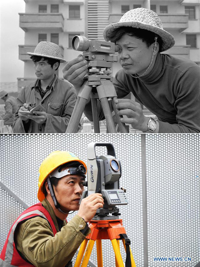 Top: File photo taken in 1984 shows survey engineers working at a construction site of a project in southwest China's Chongqing. Bottom: Photo taken on Jan. 17, 2019 by Wang Quanchao shows a survey engineer from China Construction Third Engineering Bureau Co., Ltd. working at a building construction site in Chongqing. In 1949 when the People's Republic of China was founded, the Chinese people faced a devastated country that needed to be rebuilt from scratch after decades of warfare and chaos. After decades of unremitting endeavors and dedication by the Chinese people, China has grown to be the world's second largest economy. In 1952, China's GDP was 30 billion U.S. dollars, while in 2018, its GDP reached 13.61 trillion U.S. dollars, an increase of 452.6 times. A group of combo photos give you a glimpse of what Chinese people did decades ago and what they do right now. Undoubtedly, people from all walks of life in China with hard work and wisdom have made contributions to the country's development. (Xinhua)