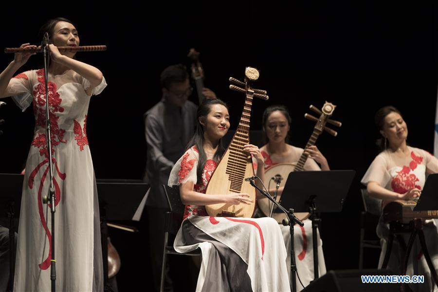Musicians from the Shanghai Chinese Orchestra perform during a reception to celebrate the 70th anniversary of the founding of the People's Republic of China (PRC), in Tel Aviv, Israel, Sept. 25, 2019. (Xinhua/Guo Yu)