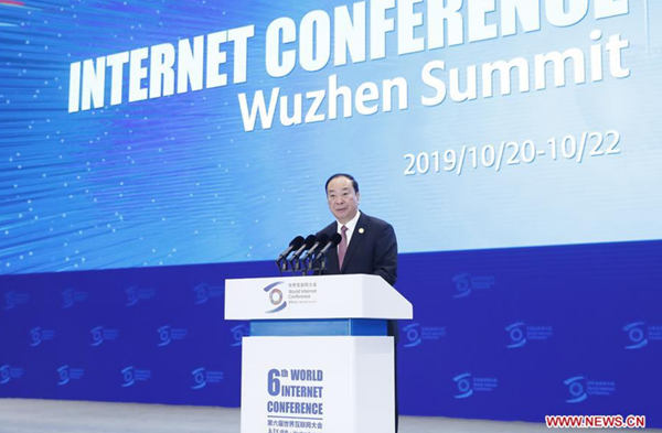 Huang Kunming, a member of the Political Bureau of the Communist Party of China (CPC) Central Committee and head of the Publicity Department of the CPC Central Committee, attends the opening ceremony of the sixth World Internet Conference in Wuzhen, east China's Zhejiang Province, Oct. 20, 2019. Before delivering his speech, Huang read Chinese President Xi Jinping's congratulatory letter to the conference. (Xinhua/Liu Bin)