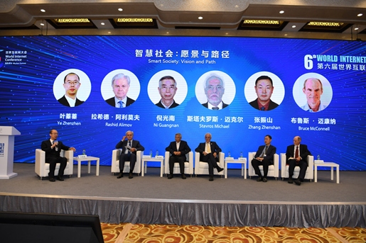 Ye Zhenzhen, president of People's Daily Online (L1) , moderates a roundtable discussion at the Ministerial Forum of the 6th World Internet Conference on Oct. 20. (Photo/Weng Qiyu)