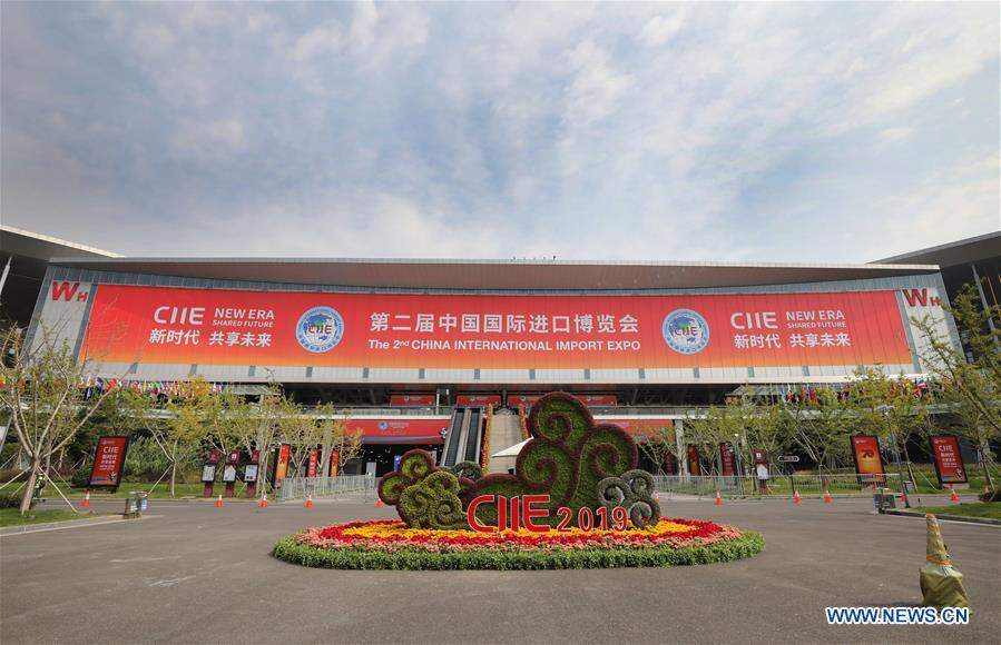 Photo shows an entrance at the National Exhibition and Convention Center in Shanghai, east China, Oct. 25, 2019. Workers and volunteers are making preparations for the upcoming 2nd China International Import Expo (CIIE). (Xinhua/Fang Zhe)