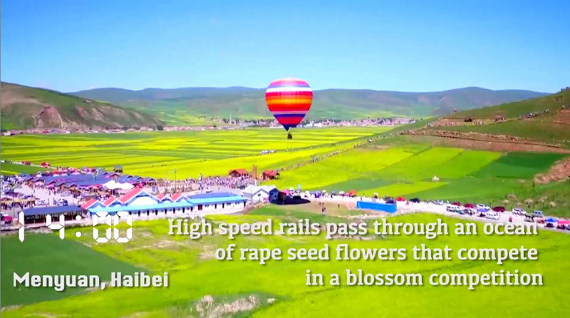 High speed rails pass through an ocean of rape seed flowers that compete in a blossom competition.