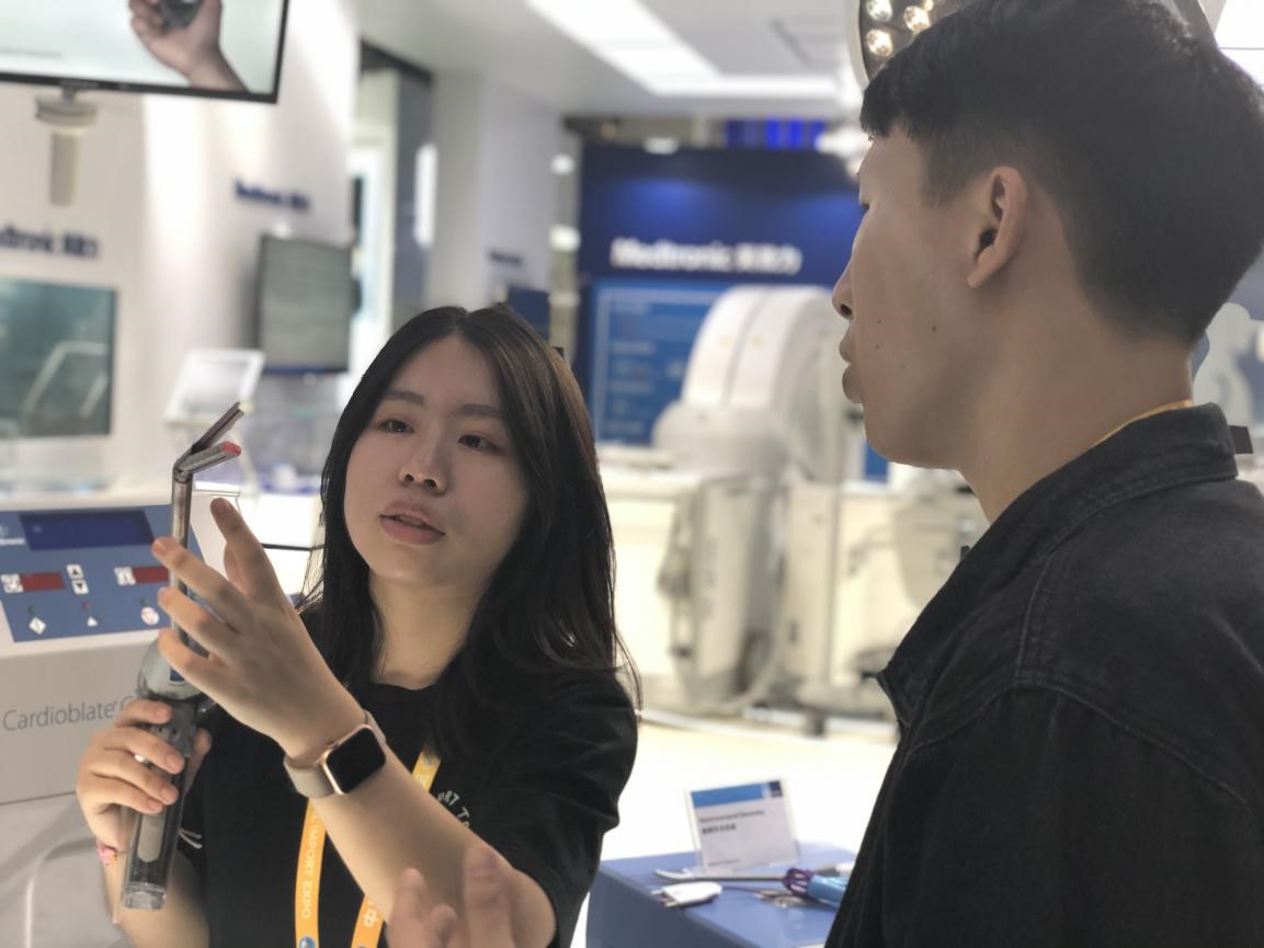 A staff member displays a smart surgical instrument to a visitor at the booth of American medical equipment producer Medtronic during the second CIIE. (Photo by Ji Peijuan from People’s Daily)