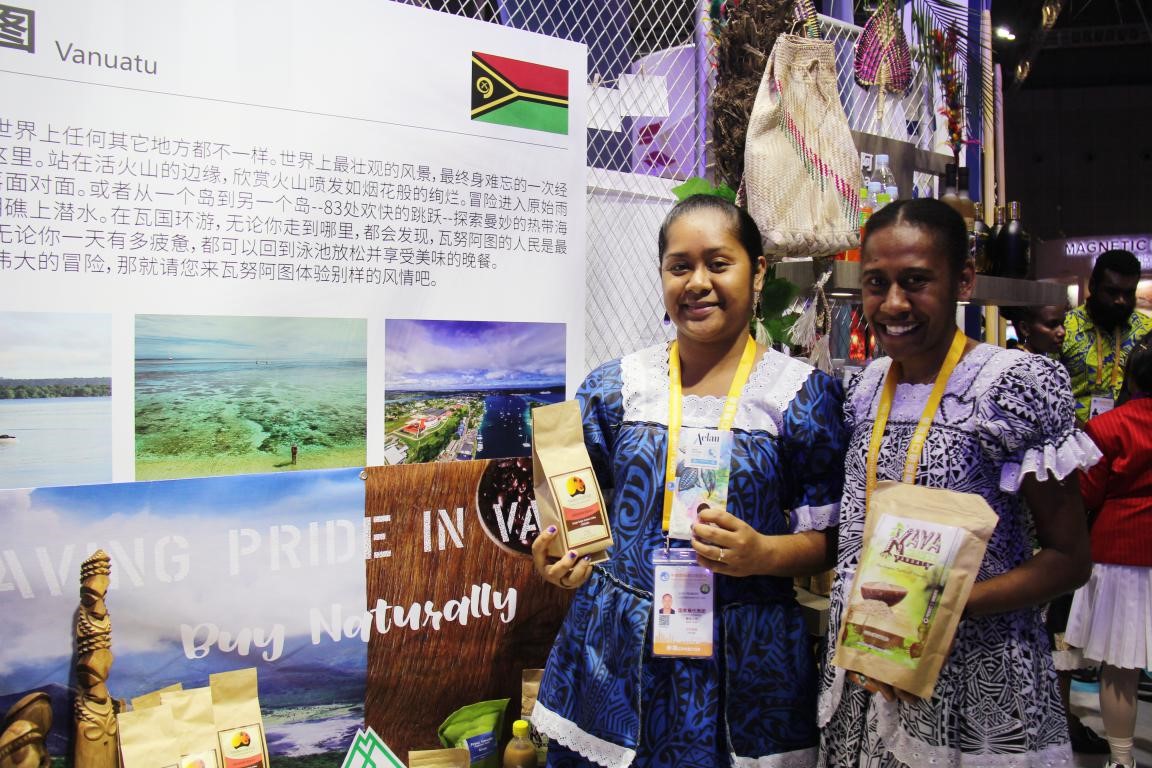Workers at the Vanuatu Pavilion display local specialties at the second CIIE. (People’s Daily/Chen Shangwen)