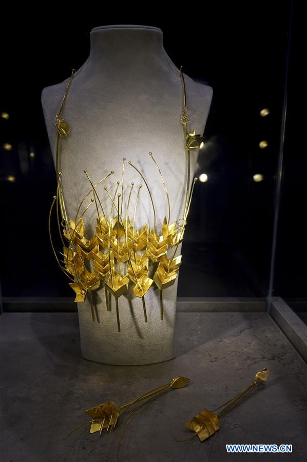Photo taken on Nov. 6, 2019 shows the accessories displayed at the Greece pavilion during the second China International Import Expo (CIIE) in Shanghai, east China. Greece is one of the guest countries of honor at the second CIIE. It leads a business delegation of 68 companies representing the most dynamic sectors of the Greek economy here. (Xinhua/Yin Gang)