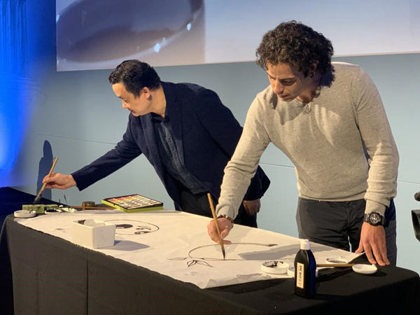 Chinese and Greek artists jointly create a painting at the exhibition “Travelling comics from China to Greece” recently held in Athens, Greece. (Photo by Ye Qi/People’s Daily)