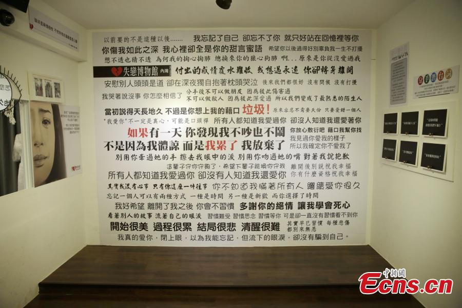A museum dedicated to failed romance has opened in Hsinchu County of Taiwan island, showing photos, gifts and slogans about broken-hearted stories. (Photo: China News Service/Zhang Yuan)