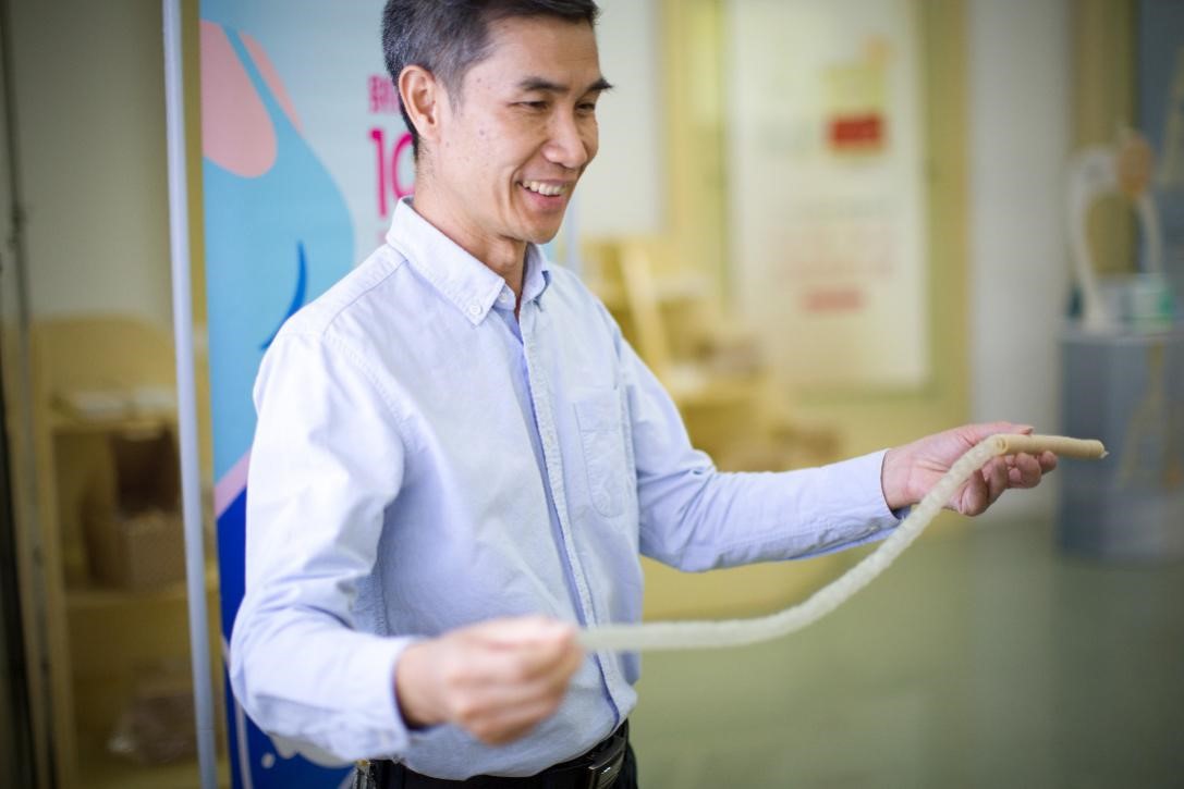 Ru Xiquan, Vice President of Shenguan Holding (Group) Co., Ltd., demonstrates a collagen casing sample. (Photo/People’s Daily Online)