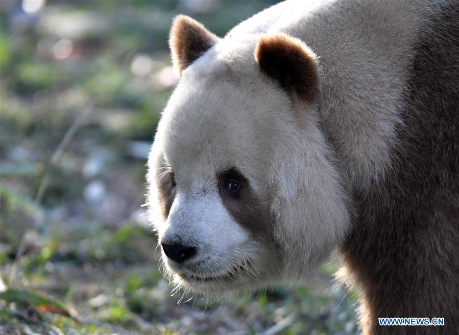 Qizai, a rare brown and white giant panda, is seen at Qinling Research Base of Giant Panda Breeding of Shaanxi Academy of Forestry in Xi'an, northwest China's Shaanxi Province, Dec. 3, 2019. (Xinhua/Zhang Bowen)