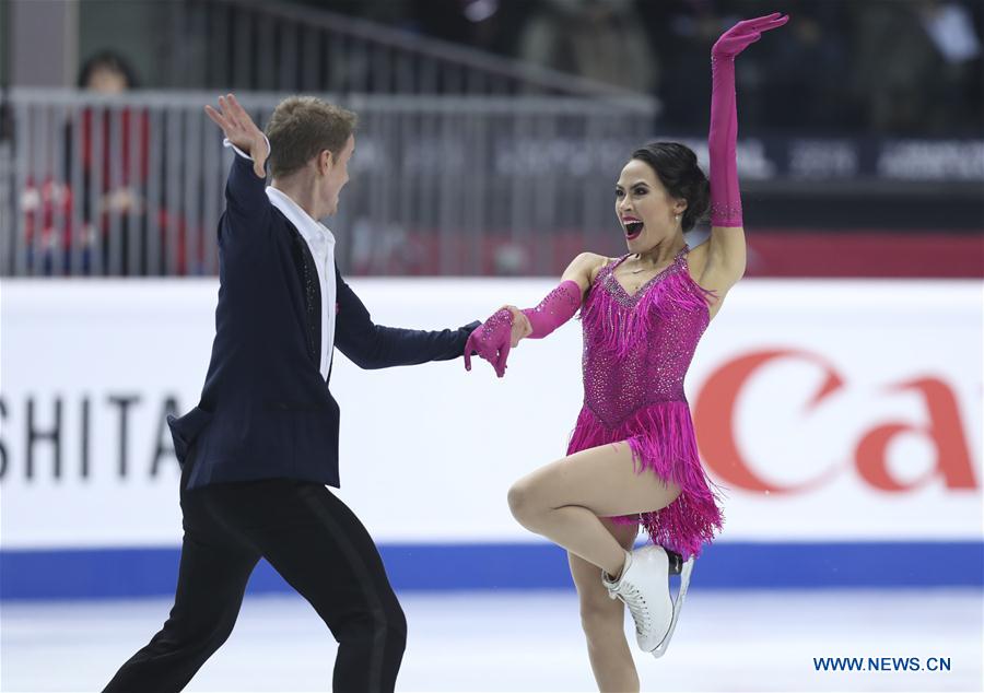 Madison Chock (R)/Evan Bates of the United States compete during the ice dance rhythm dance at the ISU Grand Prix of Figure Skating Final 2019 in Turin, Italy, Dec. 6, 2019. (Xinhua/Cheng Tingting)