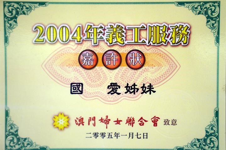 A volunteer award certificate of Kok Oi in 2004. /Photo provided by Kok Oi.