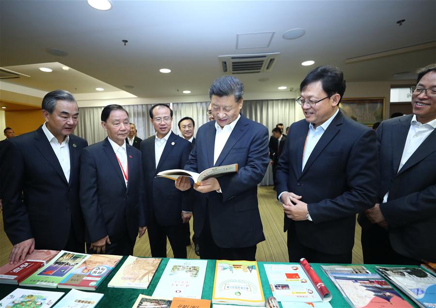 Chinese President Xi Jinping looks through textbooks on Chinese history, virtue and citizenship at the Premier School Affiliated to Hou Kong Middle School, in south China's Macao, Dec. 19, 2019. (Xinhua/Ju Peng)