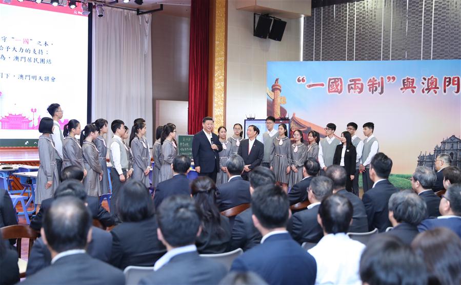 Chinese President Xi Jinping speaks after watching a Chinese history class themed "'one country, two systems' and Macao" at the Premier School Affiliated to Hou Kong Middle School, in south China's Macao, Dec. 19, 2019. (Xinhua/Ju Peng)