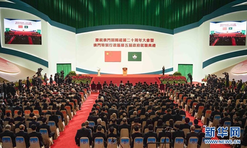 A gathering is held in the Macao East Asian Games Dome to celebrate the 20th anniversary of Macao's return to the motherland, Dec 20, 2019. [Photo/Xinhua]