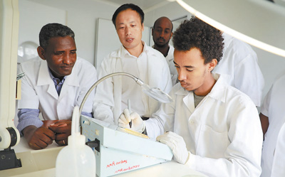 In Eritrea’s national laboratory for quality and safety control of aquatic products, Eritrean students experiment under the guidance of Chinese experts. (Photo/Lyu Qiang)