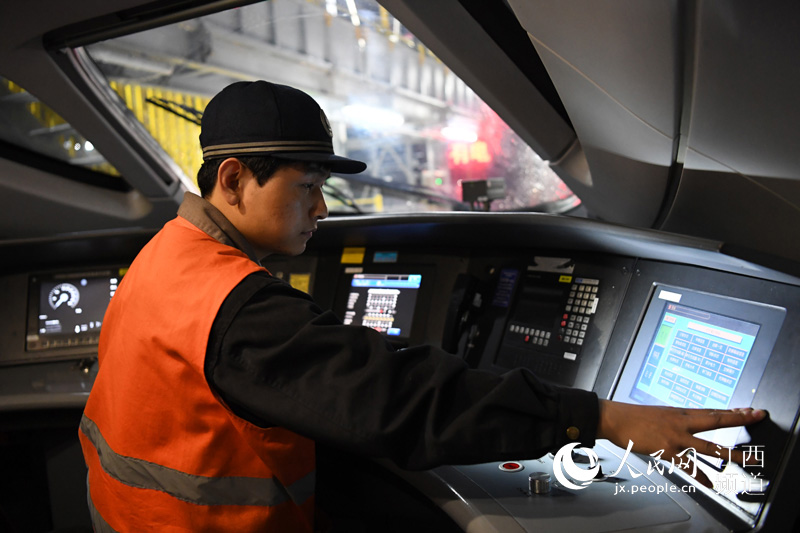 Maintenance workers check incoming high-speed trains. (Photo/Shi Yu)