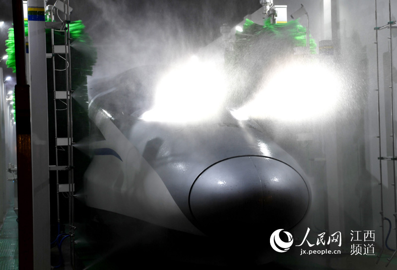 A high-speed train is being washed by a train washing machine. (Photo/Shi Yu)