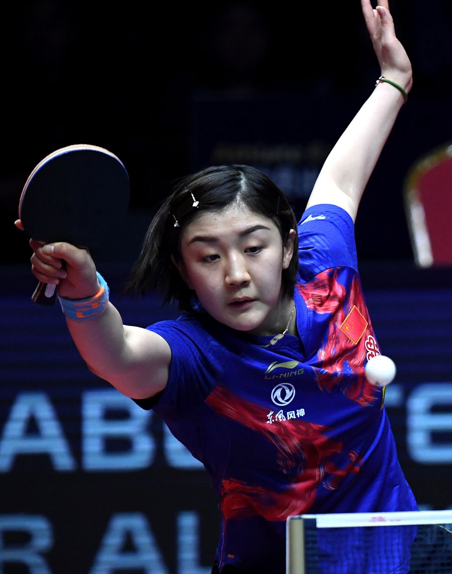 Chen Meng of China returns a shot during the women's singles semifinal match against Ito Mima of Japan at the 2019 ITTF World Tour Grand Finals in Zhengzhou, central China's Henan Province, Dec. 14, 2019. (Xinhua/Li An)