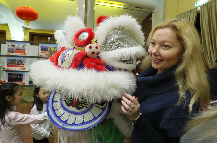 A woman poses for photos with a lion dancer during a gala to greet the upcoming Spring Festival, or the Chinese Lunar New Year, in Minsk, Belarus, Jan. 17, 2020. (Photo by Henadz Zhinkov/Xinhua)