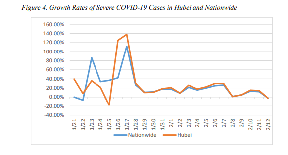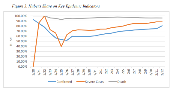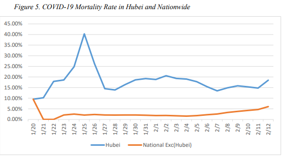 Fourth, the COVID-19-caused mortality rate is on a steady decline. As shown by the daily ratio between accumulated deaths and severe cases, the mortality rate has been decreasing significantly in Hubei (from 40% on January 25 to 18.49% on February 12) and remains low (well below 10%) in other regions of China (Figure 5).