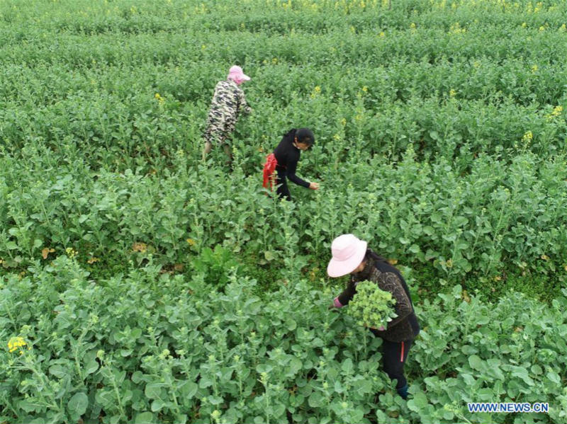 Aerial photo taken on Feb. 25, 2020 shows villagers working in the field at Yinqiao vegetable cooperative in Xiangjiangxi Village, Yiyang City of central China's Hunan Province. Under measures taken to prevent and control the novel coronavirus epidemic, villagers returned to work at the vegetable cooperative recently during the spring ploughing season. (Xinhua/Xue Yuge)