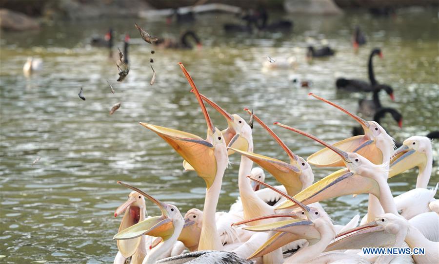 Pelicans are fed at Wuhan Zoo in Wuhan, central China's Hubei Province, March 13, 2020. Wuhan Zoo was closed on Jan. 22 after the novel coronavirus outbreak. Dozens of employees in the zoo have been sticking to their posts with feeding and disinfection work for nearly a thousand animals here. (Xinhua/Cai Yang)