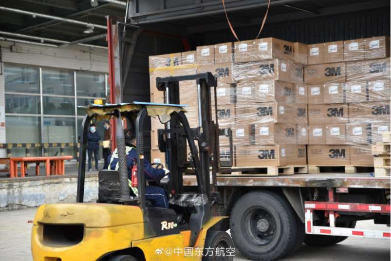 A Chinese worker loads masks donated by Shanghai to South Korea’s Daegu and Gyeongsangbuk-do, March 2. A total of 500,000 pieces of masks are donated. (Photo courtesy of China Eastern Airlines’ page on Weibo)