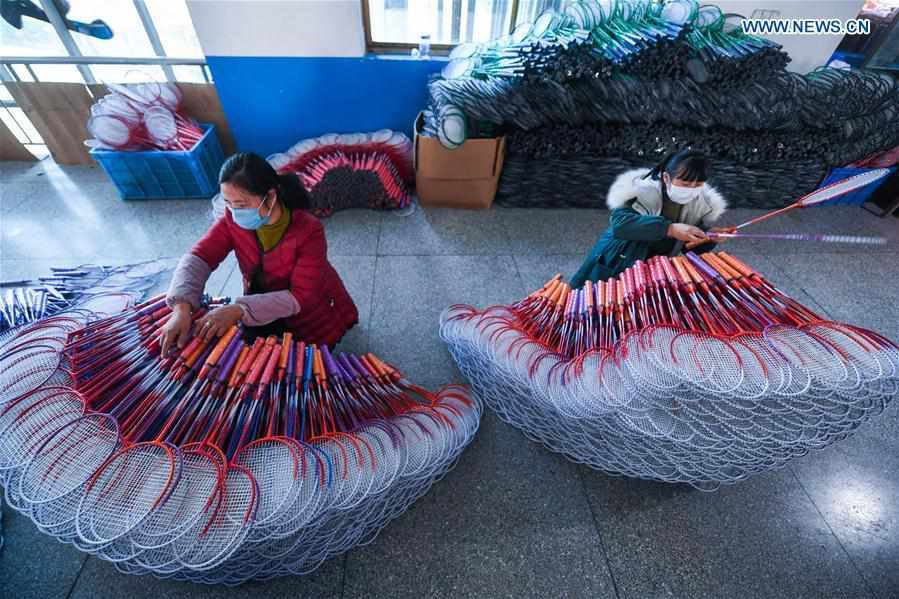 Workers package rackets at the workshop of a sporting goods company in Shangguan Township of Hangzhou, east China's Zhejiang Province, Feb. 20, 2020. (Xinhua/Xu Yu)