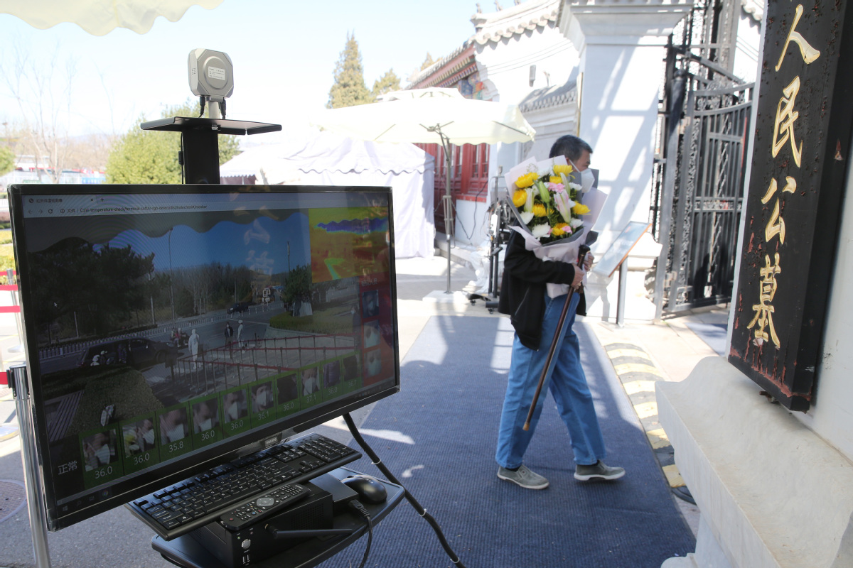 A thermal imaging camera records a visitor's body temperature as he enters the Babaoshan People's Cemetery in Beijing last month. [WANG ZHUANGFEI/CHINA DAILY]