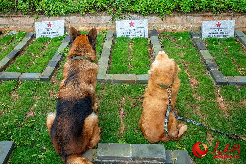Retired military dog "Weiwu" (left) and “Jinwu” (right) cherish the memory of their old comrade “Shandian” together.