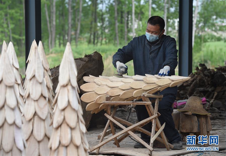 A local worker makes wooden handicrafts at a company in Wangnao village, Funan county on April 14. (Photo/Xinhua)