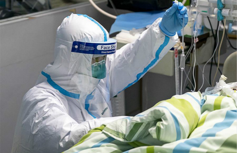 A medical worker gives a patient medical treatment in the ICU (intensive care unit) in Zhongnan Hospital of Wuhan University in Wuhan, central China's Hubei Province, Jan. 24, 2020. (Xinhua/Xiong Qi)