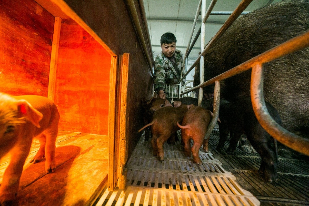 A villager checks the health condition of the piglets in Pingqing village, Nayong county, Bijie, southwest China’s Guizhou province on April 3. Photo by People’s Daily Online
