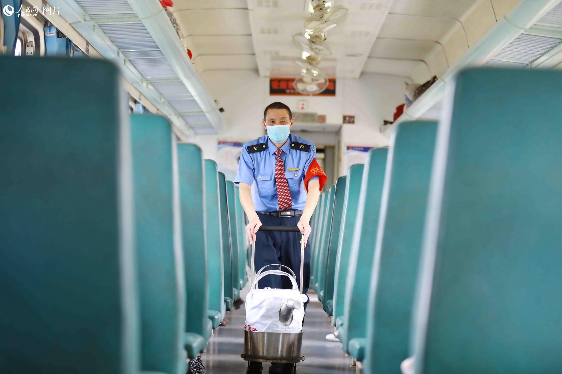 A staff member on Train No. 5633 shuttles through the compartments with a water delivery truck on May 21. (Photo/Li Kai)