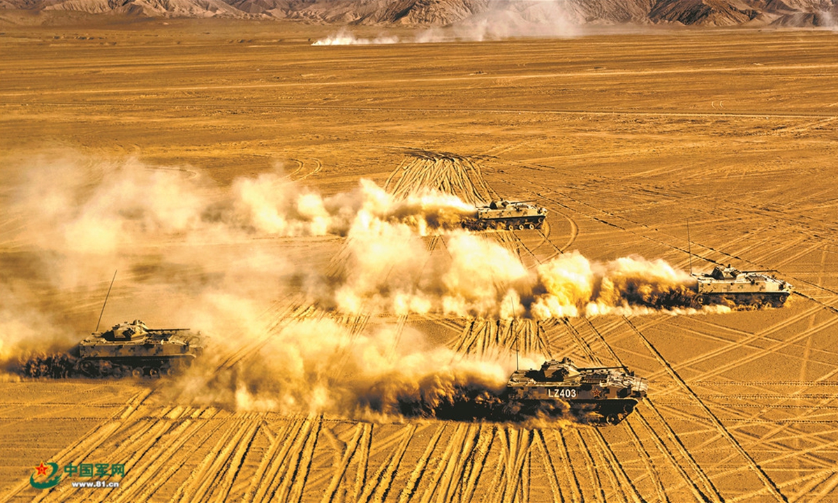 Armored vehicles launch assault on hostile positions in tactical drills by a People's Liberation Army (PLA) airborne brigade in Northwest China's desert regions on June 1, 2020. Photo: 81.cn