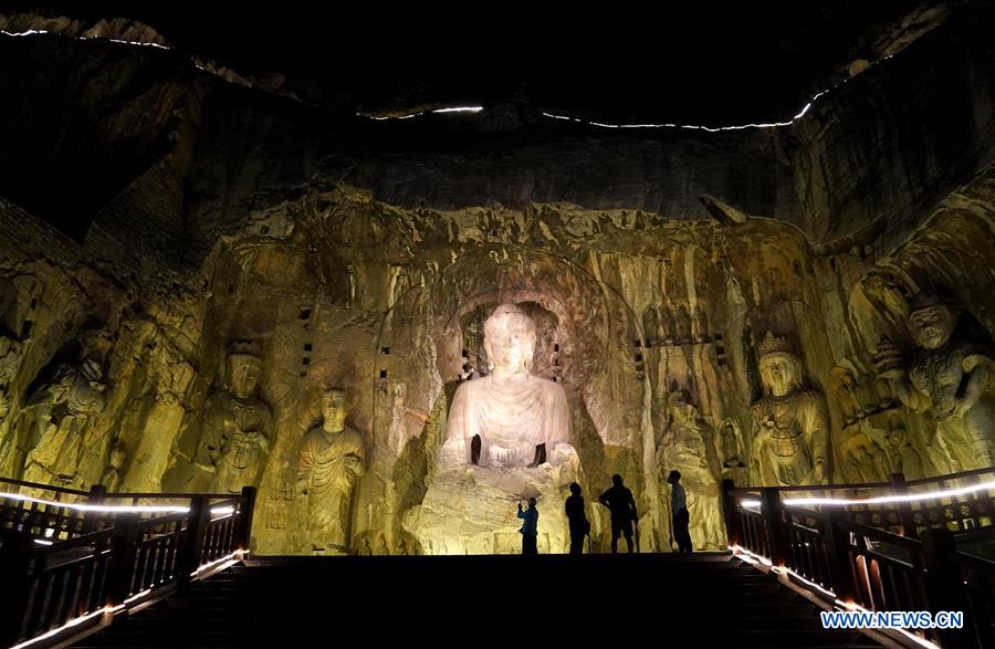 Tourists take part in a night tour at the Longmen Grottoes scenic area in Luoyang, central China's Henan Province, June 8, 2020. The Longmen Grottoes scenic area has introduced night tour programs since April 10 to meet tourist needs. Tourists can visit some of the finest Chinese Buddhist art here. (Xinhua/Li An)