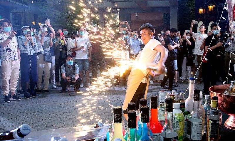A bartender performs at a night fair at Sinan Mansions in Shanghai, east China, May 24, 2020. (Xinhua/Chen Fei)